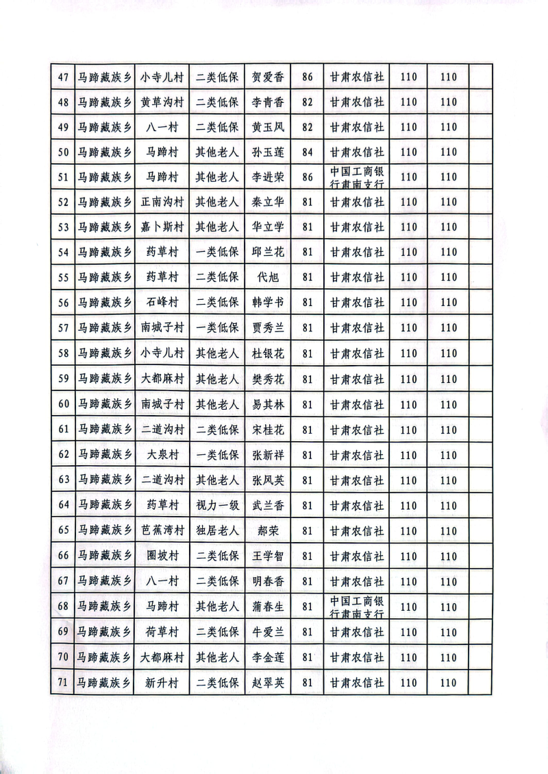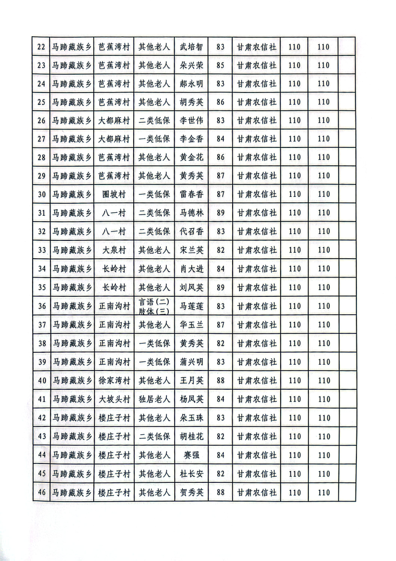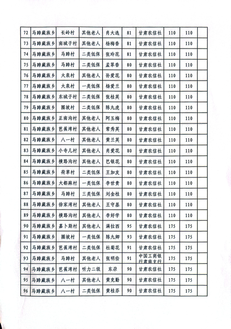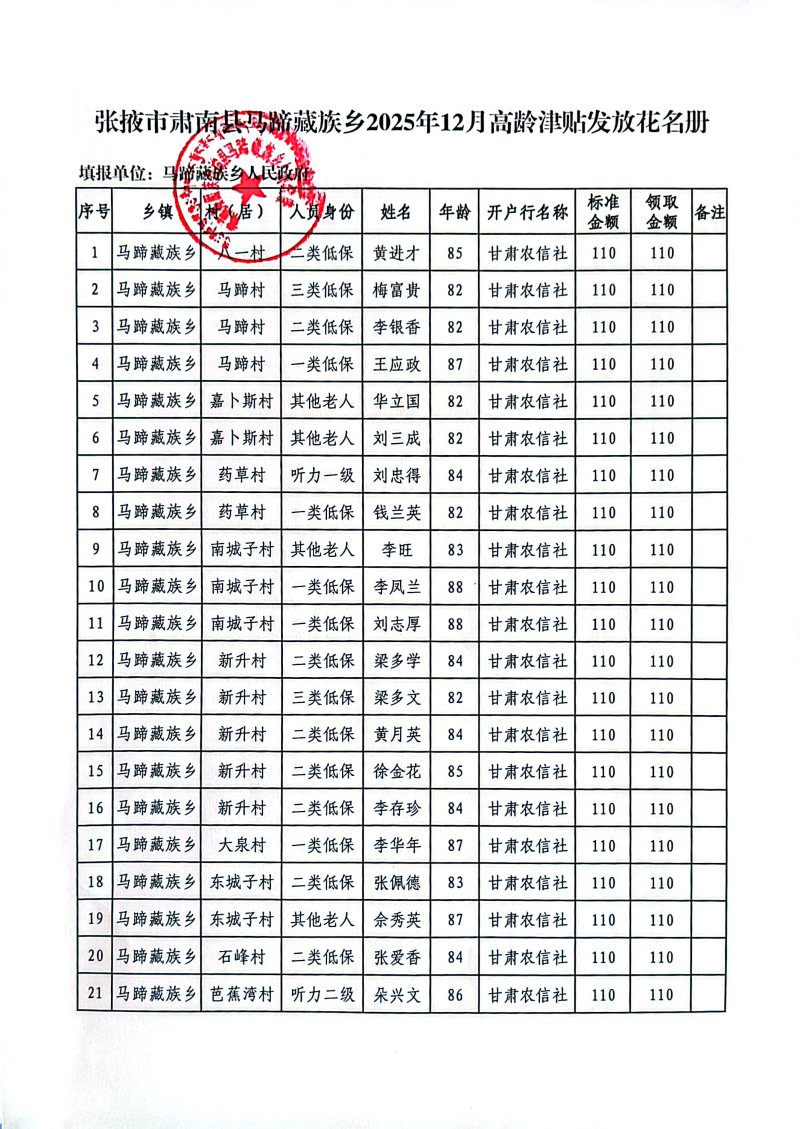 肃南县马蹄藏族乡2025年12月份高龄津贴公示
