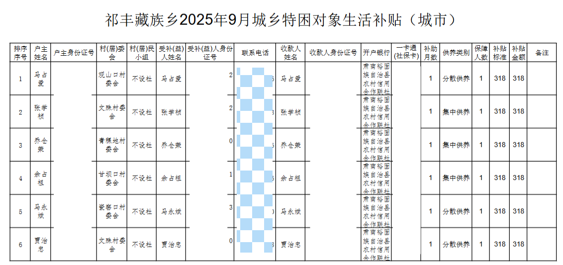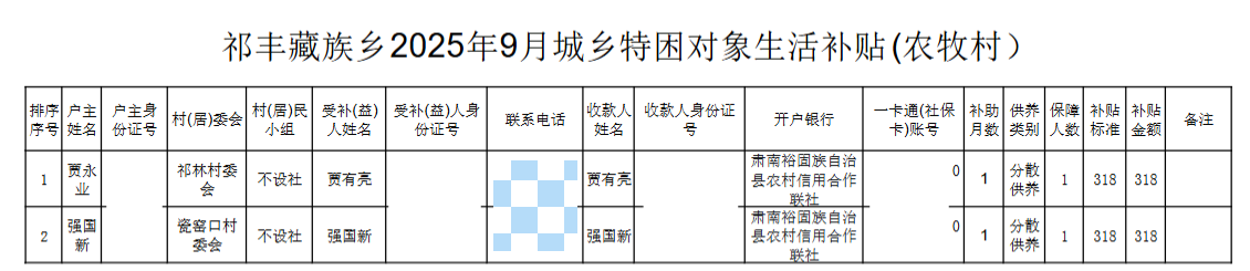 祁丰藏族乡2025年9月城乡特困对象生活补贴