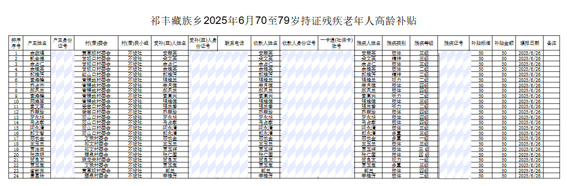 祁丰藏族乡2025年6月70岁至79岁持证残疾老年人高龄补贴