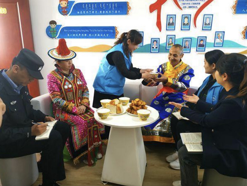 以法律法规为准绳,在法治护航中构建调解闭环。红湾寺镇将“一碗奶茶”调解法与法治建设深度融合,形成“排查-调解-普法-回访”的全链条机制。依托网格化管理体系,网格员通过排查走访实时掌握矛盾线索,做到“早发现、早介入”。调解过程中,调解员严格遵循“法理情”融合原则,既讲法律条款,又讲民族习俗,更讲邻里情谊。在农粮家属楼噪音扰民纠纷中,双语调解员针对李奶奶汉语交流困难的问题,用裕固语耐心解释《中华人民共和国噪声污染防治法》,并引用裕固族谚语“茶凉了难入口,心凉了难回头”,及时协调餐馆调整经营时间,最终双方握手言和,既维护了法律权威,又兼顾了邻里和谐,调解成功后,调解员还通过“奶茶议事日”跟踪回访,确保协议落实到位,邻里更加团结和睦。